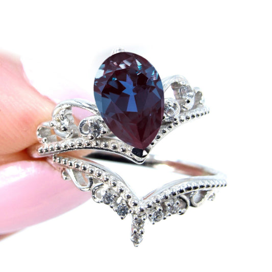 Alexandrite Diamond Pear Engagement Ring V Crown Tiara Wedding Band Set Royal Princess Custom 14k White Gold Anniversary Bridal Ring set