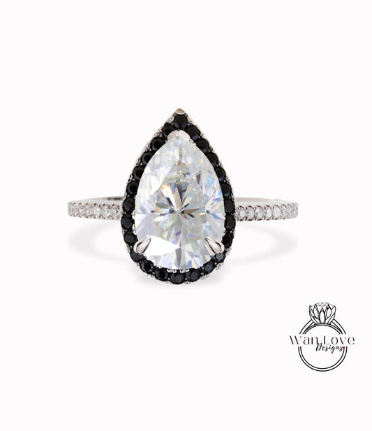 Black Diamonds Halo Pear cut Moissanite Engagement Ring Custom / 14k 18k White Yellow Rose Gold / Platinum / Wedding Ring / Anniversary Gift