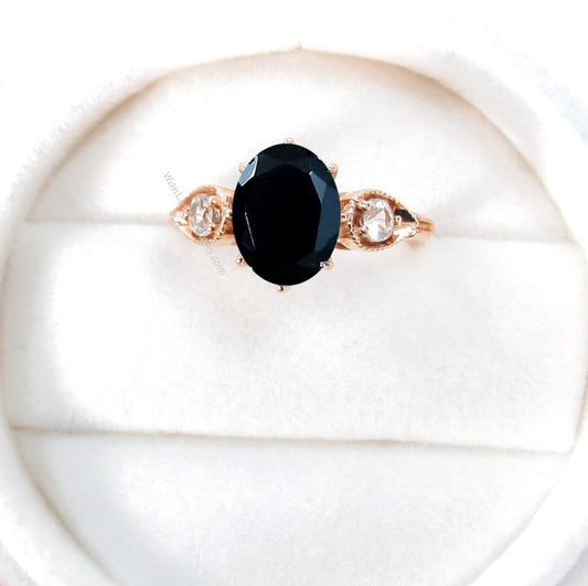 Black Spinel Diamond 3 Gem Oval Round Pear Bezel Milgrain 8 prong Engagement Ring,3ct,9x7mm,3mm,Custom,Wedding,14k 18k White Rose Yelow Gold
