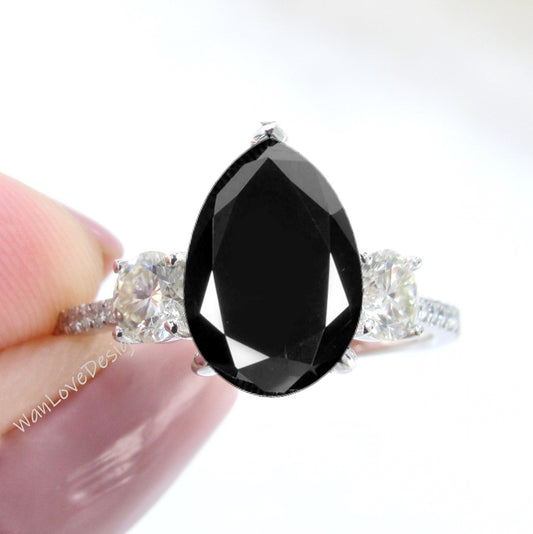 Black Spinel Diamond Moissanite Pear Round 3 Stone Minimalist Dainty Engagement Ring 2ct Wedding Anniversary Gift