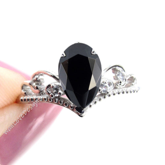 Black Spinel Diamond Pear Crown Tiara Royal Princess V Contoured Engagement Ring, Custom, 14kt 18kt Gold, Platinum, WanLoveDesigns