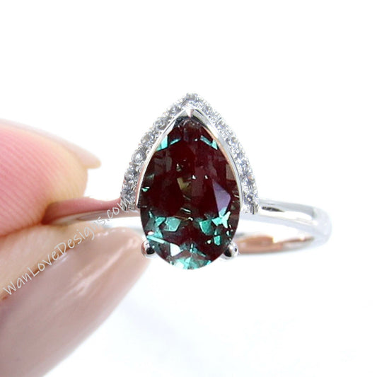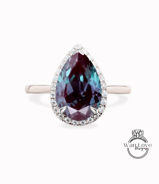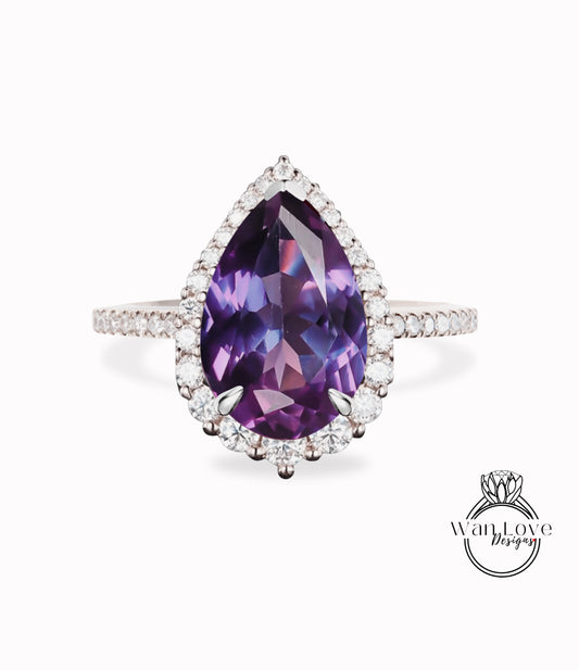 Alexandrite Diamond Pear Halo Engagement Ring, Plain Shank, Custom-14k White Yellow Rose Gold, Platinum, Anniversary Gift, WanLoveDesigns