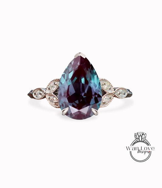 Alexandrite Pear engagement ring vintage unique Cluster rose gold engagement ring women Round diamond wedding Bridal art deco Anniversary