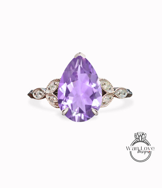 Amethyst & Diamond Pear Milgrain Leaf Engraved Engagement Ring 14kt 18kt Gold Platinum Custom Anniversary Gift for her, WanLoveDesigns