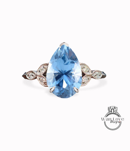 Aquamarine Blue Spinel & Diamond Pear Leaf Antique Cluster Engagement Ring Engraved Milgrain o Smooth 14kt 18kt Gold Platinum Custom Wedding
