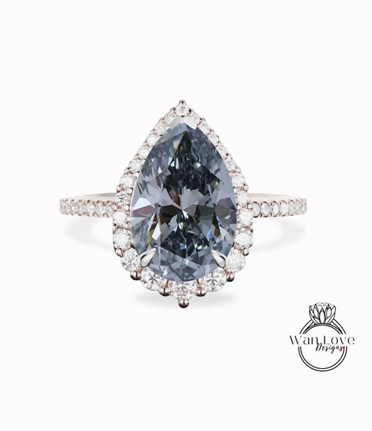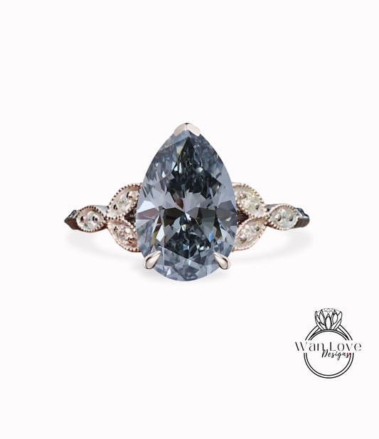 Antique Pear shaped Gray Moissanite engagement ring vintage Art deco Unique ring white gold Diamond halo wedding promise ring Anniversary ring