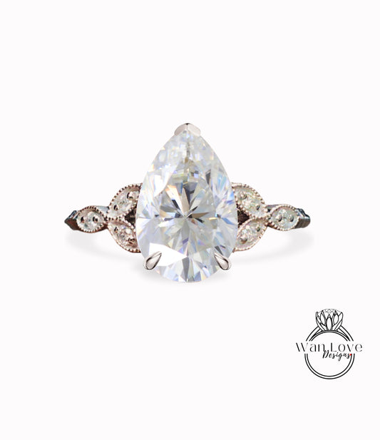 Antique Cluster pear engagement ring| vintage moissanite twig leaf wedding ring|Cluster Pear shaped engraved Bridal ring|Anniversary ring