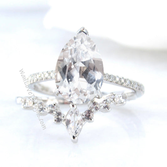 2PCS White Sapphire engagement ring white gold Pear shaped Unique Cluster vintage ring vintage Marquise curved wedding band Promise gift