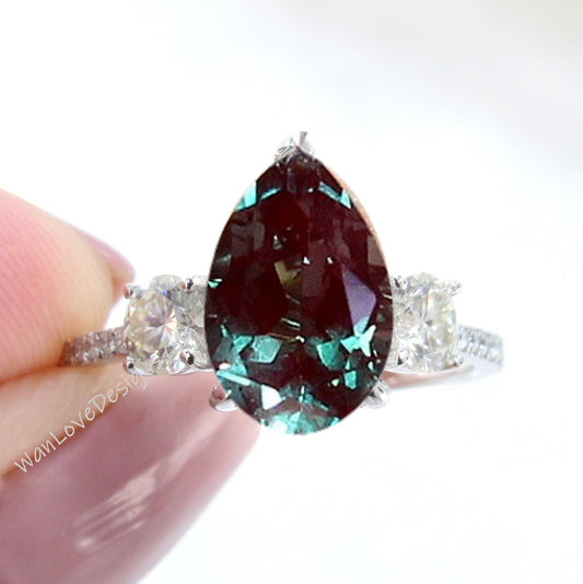 Alexandrite Diamond Moissanite Pear Round 3 Stone Minimalist Dainty Engagement Ring Wedding Anniversary Gift