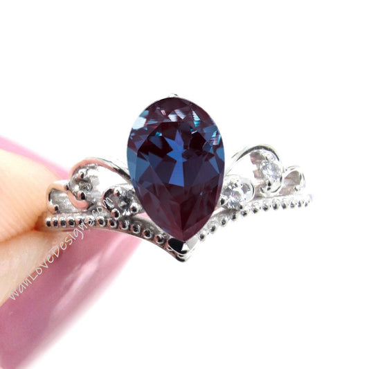 Alexandrite Diamond Pear Crown Tiara Royal Princess V Contoured Engagement Ring, Custom, 14kt 18kt Gold, Platinum, WanLoveDesigns