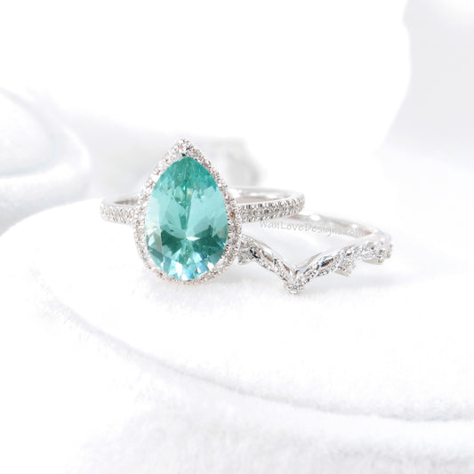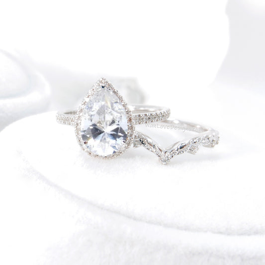 Pear halo white sapphire and diamond ring set, engagement ring and 7 gem wedding band, pear ring, diamond wedding ring, leaf engagement ring