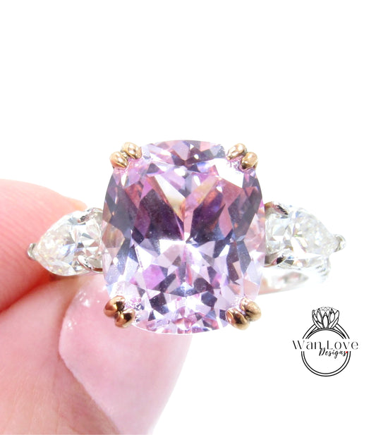6ct Light Pink Sapphire Moissanite 3 Gemstone Engagement Ring Elongated Cushion cut Pear ring three gem stone ring Wedding Anniversary Gift