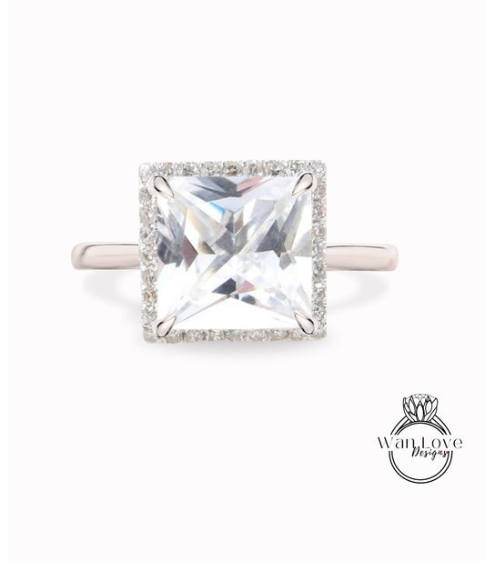 White Sapphire Diamond Princess Halo Engagement Ring Plain Shank Square Wedding Custom 14kt 18kt Gold, Platinum, WanLoveDesigns