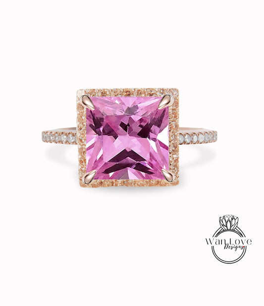 Pink Sapphire & Diamond Princess Halo Engagement Ring Square Cathedral Custom 14k White Yellow Rose Gold Platinum Wedding, WanLoveDesigns