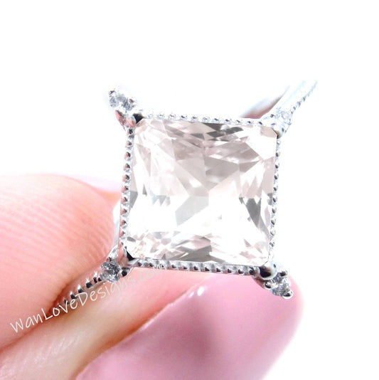 White Sapphire & Diamond Milgrain Kite NSEW Princess Engagement Ring, Custom,14k 18k White Yellow Rose Gold-Platinum,Wedding, WanLoveDesigns