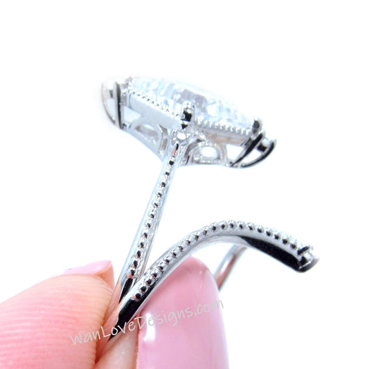 White Sapphire Emerald Milgrain Bezel Princess Round Halo Engagement Ring Antique Moissanite Custom Wedding