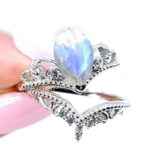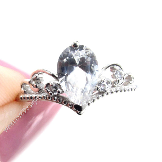 White Sapphire Diamond Pear Crown Tiara Engagement Ring, Royal Princess V Contoured Wedding Band, Pear White Sapphire Ring, Bridal gift her