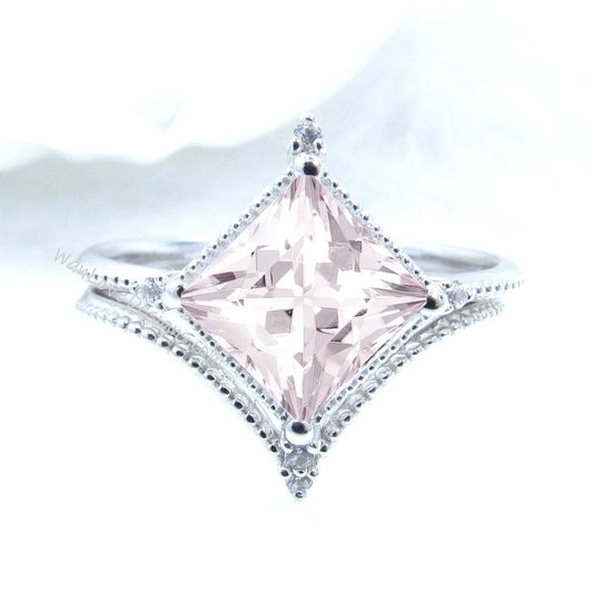 Pink Sapphire & Diamond Milgrain Princess Kite NSEW Engagement Ring Set, V Chevron Wedding Band, Custom, 14kt 18kt Gold, Platinum