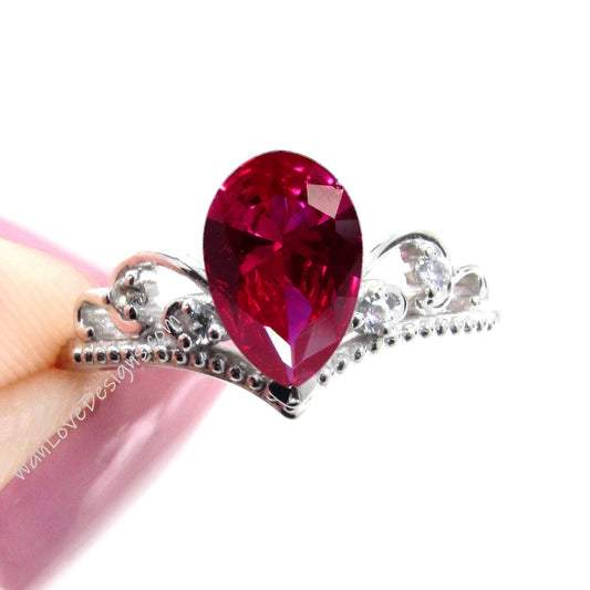 Ruby Diamond Pear Crown Tiara Royal Princess V Contoured Engagement Ring, Custom, 14kt 18kt Gold, Platinum, WanLoveDesigns