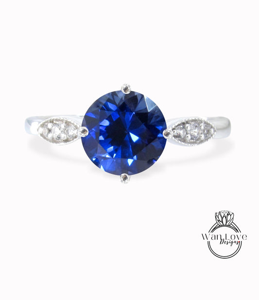 Blue Sapphire & Diamond Engagement Ring, Milgrain Leaf Nature Round Antique Vintage style, 14k 18k White Yellow Rose Gold-Platinum-Custom