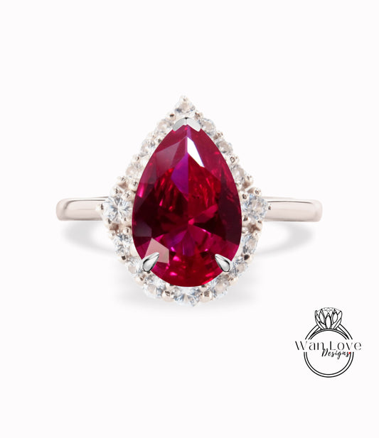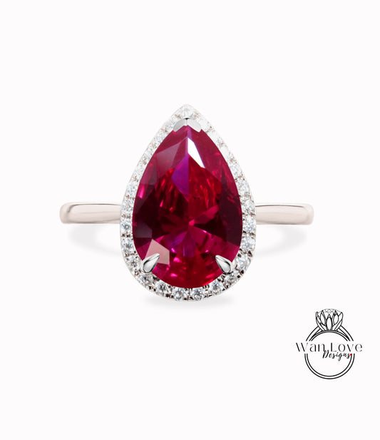 Pear shaped Ruby engagement ring vintage Unique tapered band diamond halo engagement ring white gold wedding Bridal gift for women