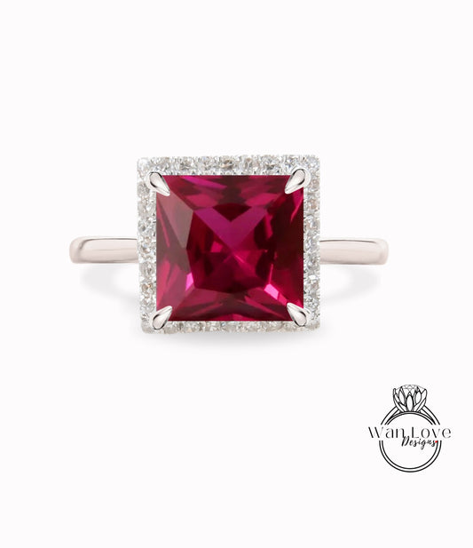 Ruby & Diamond Princess Halo Plain tapered band Engagement Ring, Cathedral Basket,Custom,Square wedding ring,14kt 18kt Gold,Platinum, Anniversary gift