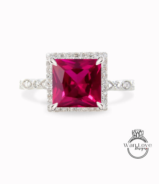 Ruby & Diamonds Halo Princess Scalloped Milgrain Vintage Pink Sapphire Engagement Ring/ Antique Style Anniversary Rings/ 14K Solid White Gold Rings