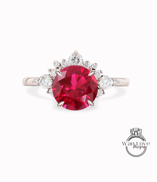 Ruby Cluster Half Halo engagement ring Diamonds Unique cluster White Rose Gold Ring woman Promise Anniversary Gift