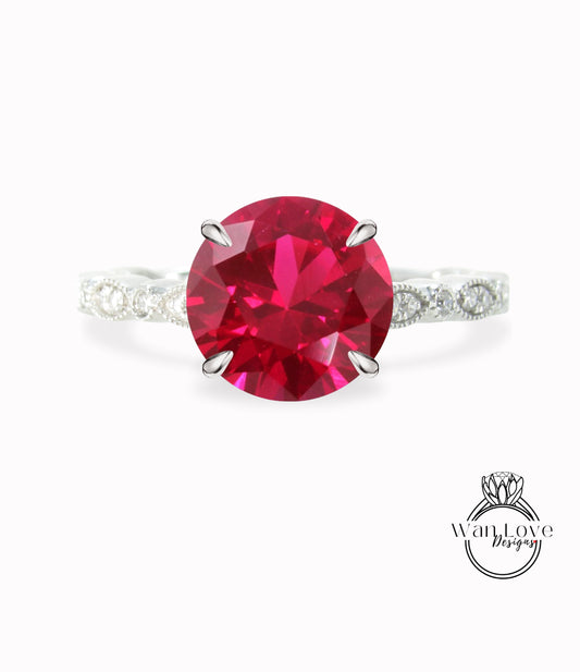 Round Ruby Ring Vintage Solid Rose Gold Engagement Ring scalloped Diamond Wedding Ring Art Deco milgrain Promise Bridal Wedding Ring