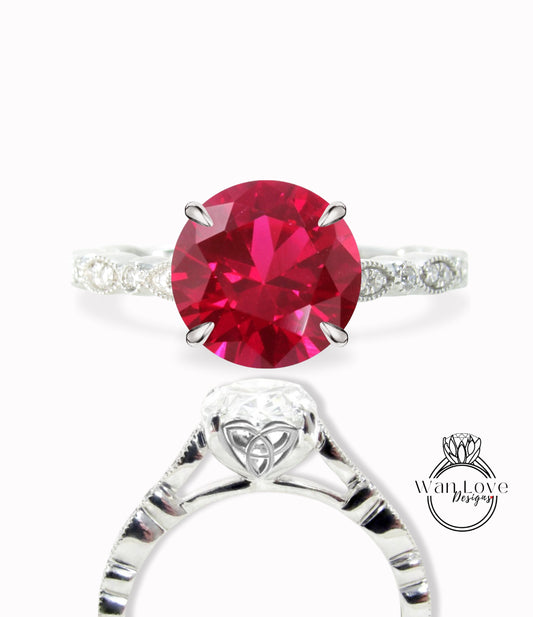 Ruby & Diamond Round Celtic Knot milgrain scalloped band Engagement Ring 14k 18k White Yellow Rose Gold Platinum Wedding Anniversary Gift