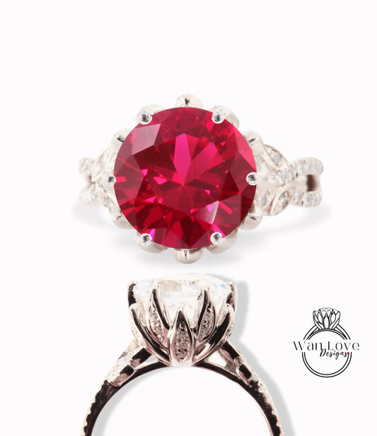 Ruby & Diamond Lotus Flower Split Shank Leaf Engagement Ring, 14k 18k White Yellow Rose Gold, Platinum,Custom,Wedding,Gift