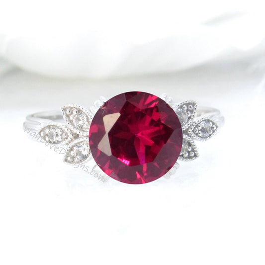 Ruby Diamond Milgrain Leaf Engagement Ring Nature Antique Vintage style Round Custom Wedding 14k 18k Gold Platinum, WanLoveDesigns