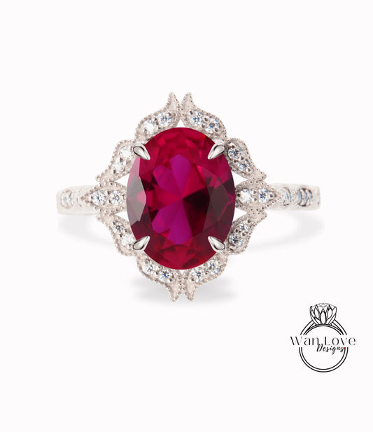 Oval Ruby Engagement Ring vintage Unique Round halo diamond Cluster ring Rose gold ring antique diamond Bridal ring Anniversary gift