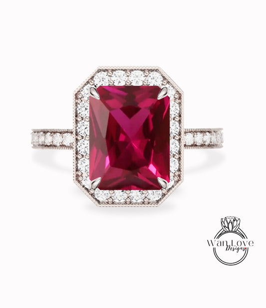 Milgrain Halo Emerald Ruby Diamond Engagement Ring/ Half Eternity Red Ruby Rings/ Diamond Halo Wedding Rings/ Statement Ring