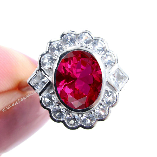 Ruby & Moissanite Oval Semi Bezel Cluster Princess Round Halo Engagement Ring Custom Wedding Jewelry