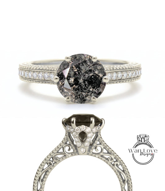 Salt & Pepper Diamond Round Beaded Milgrain Engagement Ring unique vintage filigree Rose Gold Anniversary Gift antique wedding bridal ring