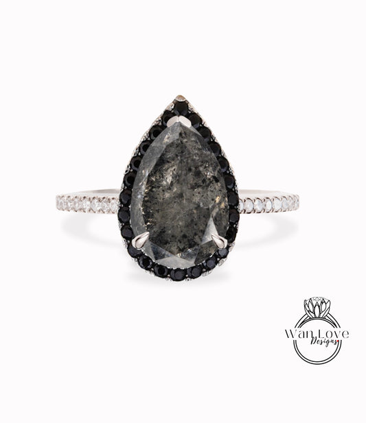 Salt & Pepper Black White Diamond Halo Engagement Ring, Pear, 14k 18k White Yellow Rose Gold-Platinum-Custom-Wedding-Basket