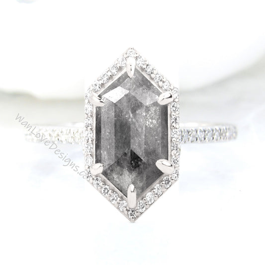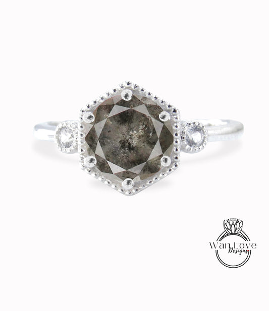 Halo Salt & Pepper Diamond Hexagon Engagement Ring, Hexagon moissanite ring, Hexagon milgrain ring