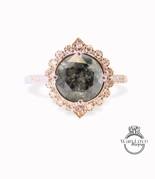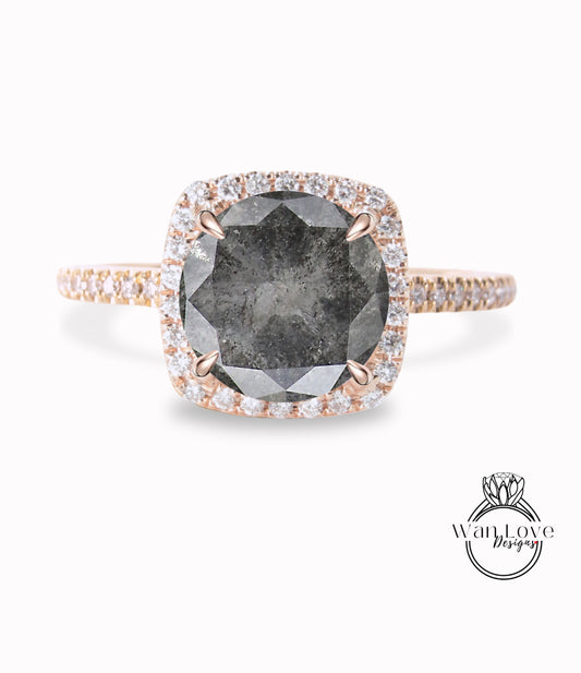 Salt & Pepper Diamond Cushion Halo Round Engagement Ring Custom, Wedding, Anniversary Gift, 14k 18k White Rose Yellow Gold