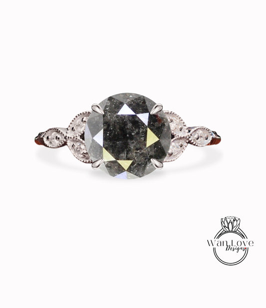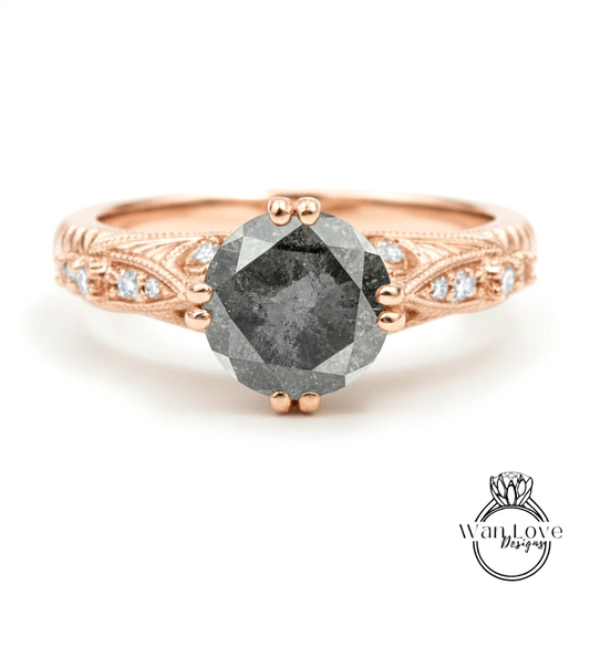Salt & Pepper Diamond Engraved Antique Engraving Engagement Ring, Round, Custom-14k 18k White Yellow Rose Gold-Platinum-Wedding