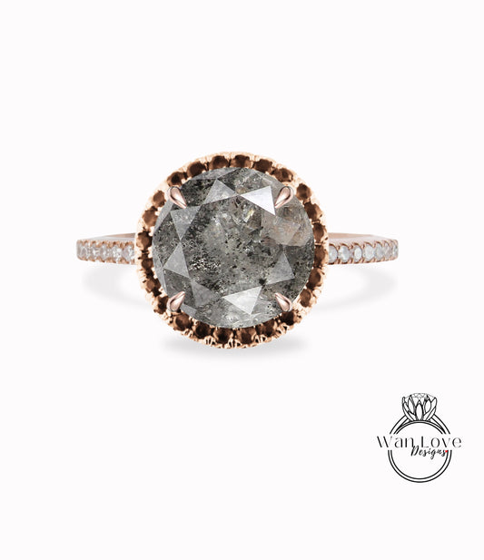 Salt & Pepper Diamond Black and White Round Halo Engagement Ring, Custom, 14k 18k White Yellow Rose Gold,Platinum,Wedding,Aniversary Gift