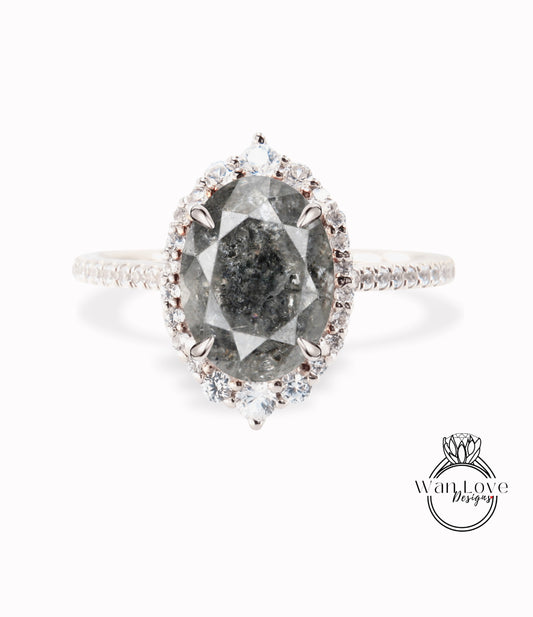 Salt & Pepper Diamonds Oval Graduated Halo Engagement Ring Custom, Wedding, Anniversary Gift,14k 18k White Rose Yellow Gold