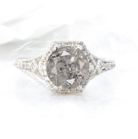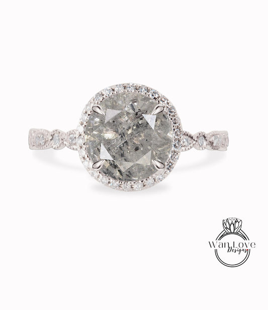 Salt & Pepper Diamond Scalloped Engagement Ring, Milgrain Vintage Salt Pepper Diamond Bridal Ring, Round Halo Diamond Ring, Anniversary ring