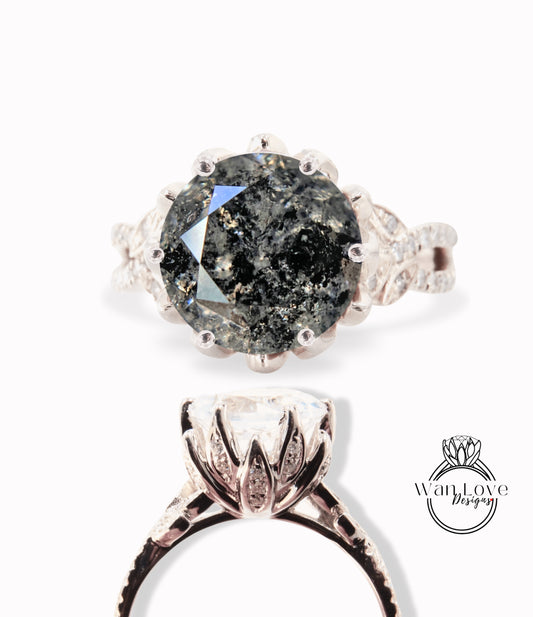 Salt & Pepper Galaxy Diamond Lotus Flower Split Shank Leaf Engagement Ring Round 14k 18k White Yellow Rose Gold Platinum Custom Wedding