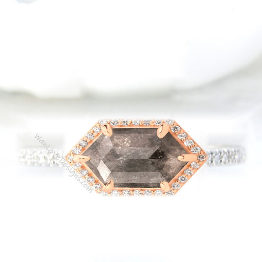Salt & Pepper Diamond East West Hexagon cut Halo Engagement Ring Wedding-Aniversary Gift-Custom, 14k 18k White Yellow Rose Gold