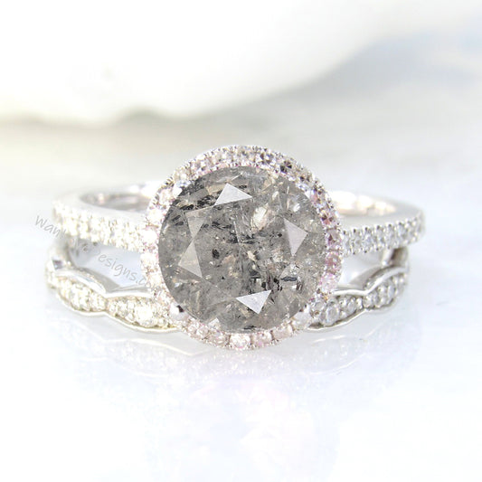Salt & Pepper Diamond Halo Round Engagement Ring set, Scalloped Wedding Band, Custom, 14kt 18kt Gold-Platinum
