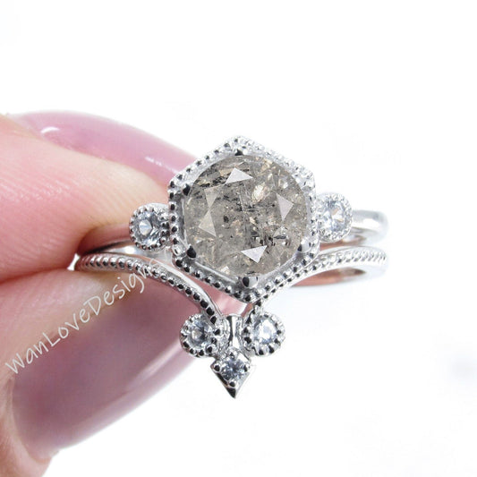 Salt Pepper Diamond Hexagon Engagement Ring set, Milgrain Nesting Band, Contoured Curved Wedding, 14k White Yellow Rose Gold, Custom