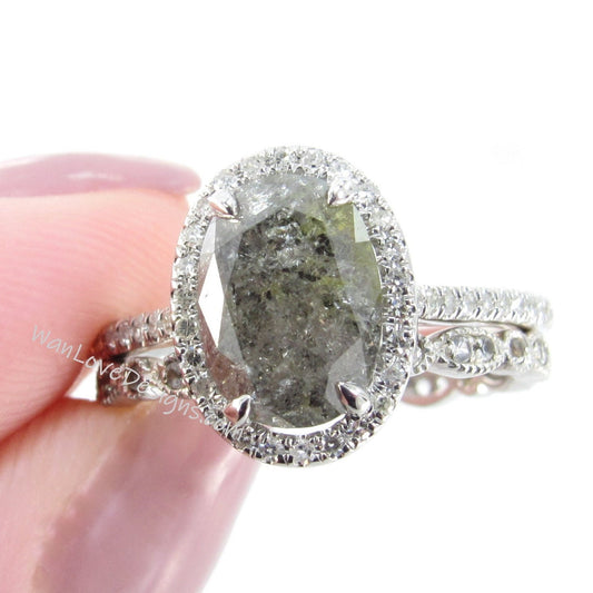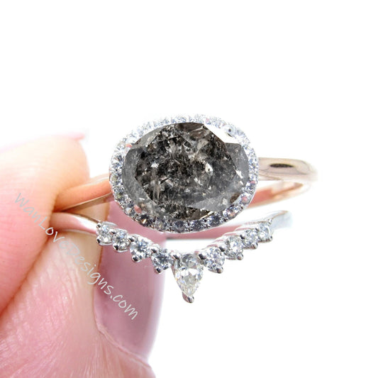 Oval Halo Salt & Pepper diamond ring set, engagement ring and wedding band, galaxy diamond ring, diamond wedding ring, leaf engagement ring