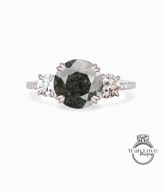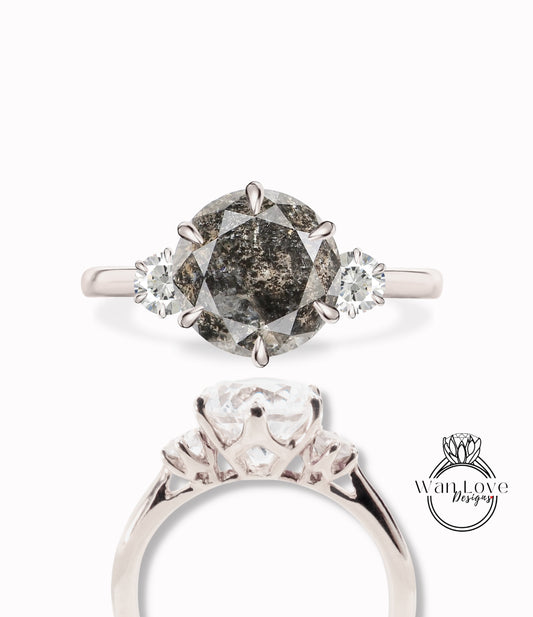 Salt and Pepper Diamond & Diamond 3 gem Stone Engagement Ring 6 prong trellis Round three gemstone ring 14k 18k White Yellow Rose Gold Platinum-Custom-Wedding Anniversary Gift