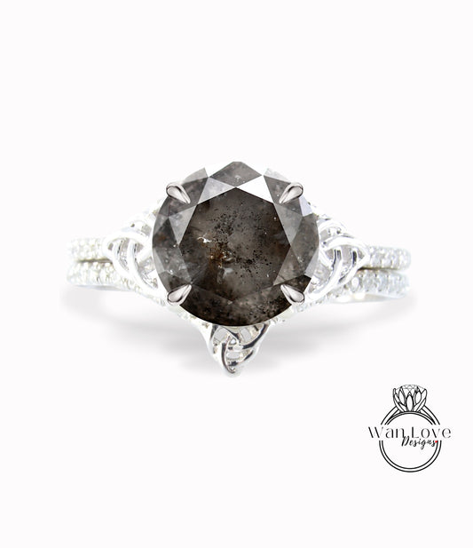 Salt & Pepper Diamond Celtic Knot Round Engagement Ring, Custom, 14k 18k White Yellow Rose Gold, Platinum-Wedding-Anniversary Gift